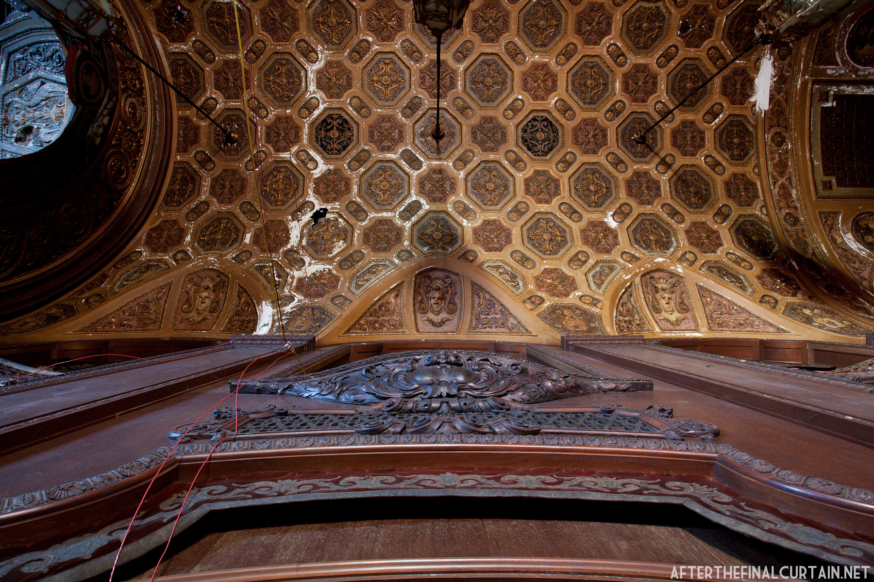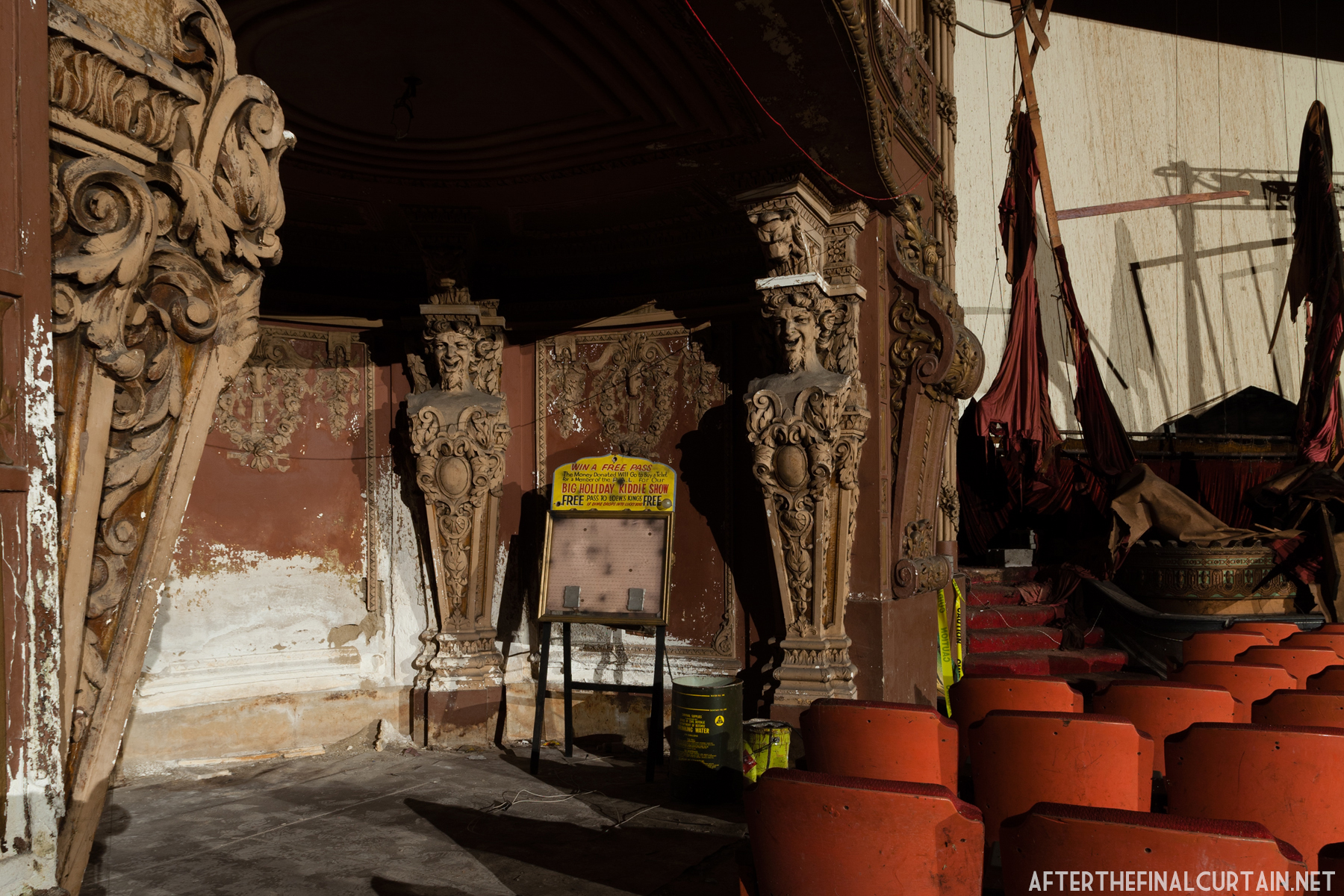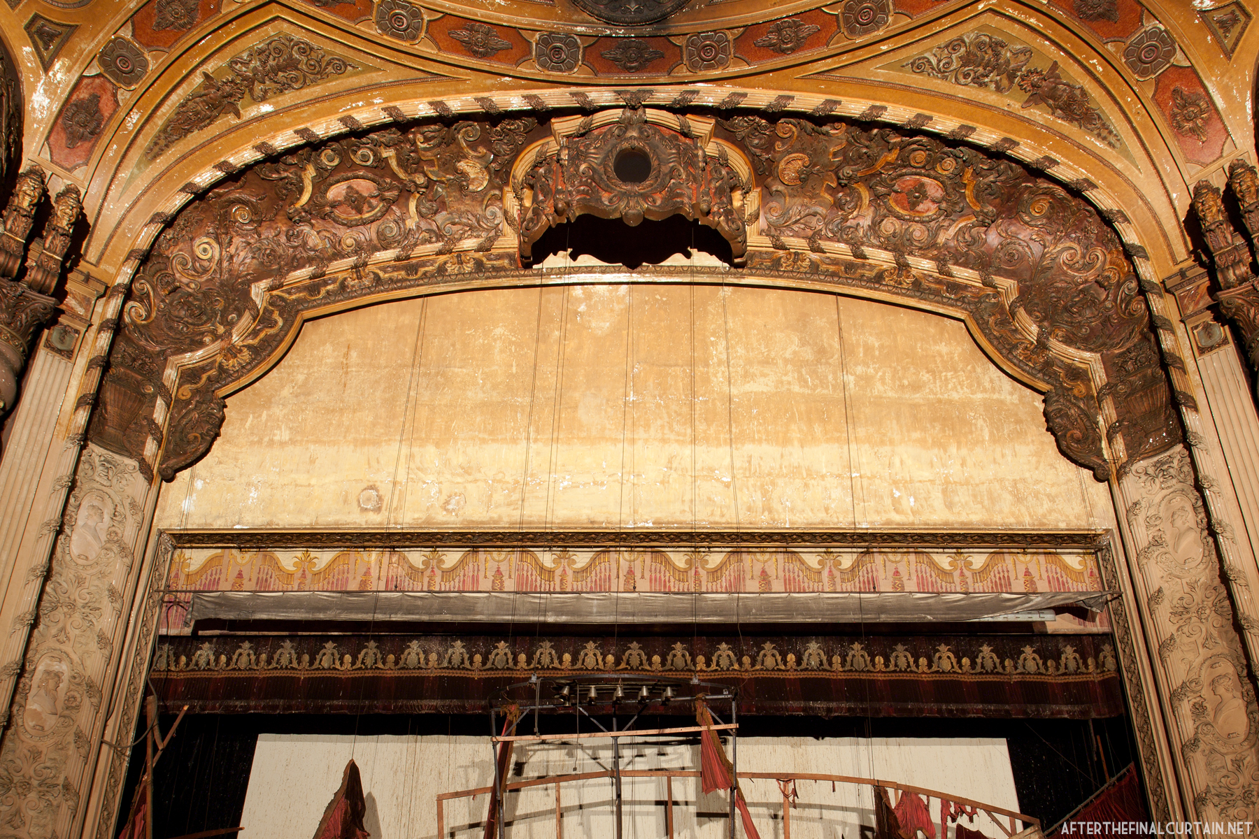 Thanks! The orchestra lift is still there, but the organ lift is not. I think it was sealed up when the organ was removed in 1974. The curtain collapsed on to the stage, if there was any stage elevators on the stage, they’re probably under that.
