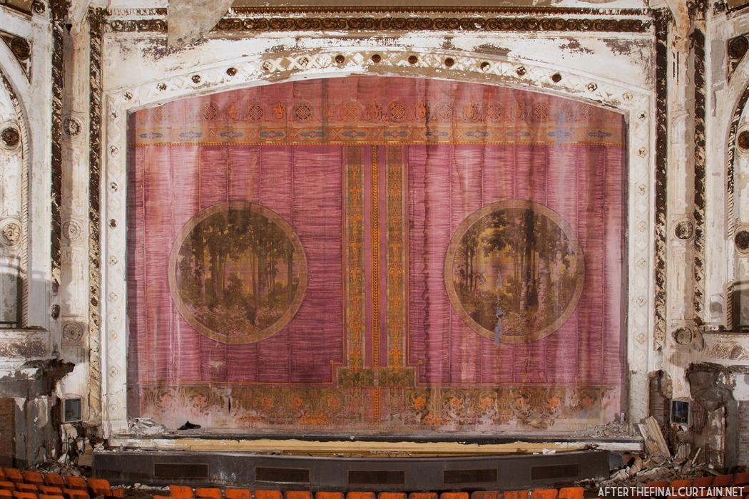 Do you know if the curtain is actually a thread-bare and aged piece of fabric, or if it is actually a painted asbestos fire-curtain? I know many theaters from that era have quite elaborately painted fire-curtains.