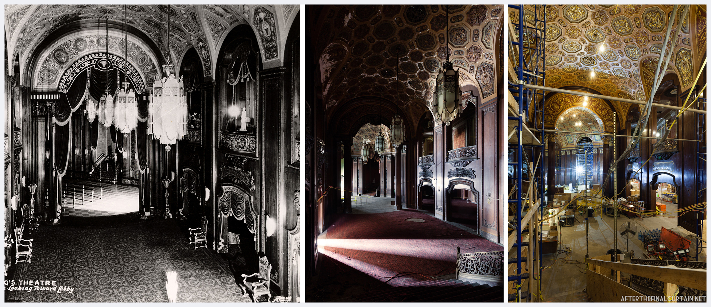 The photos in the triptych above are of the Loew’s Kings Theatre lobby when the theater was open, 30 years after it had been closed, and six months into the restoration.