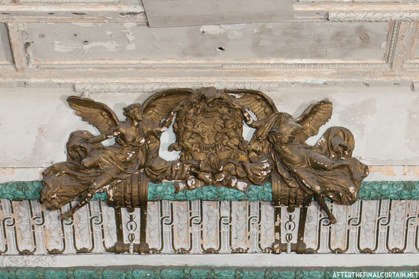 The plasterwork at the top of the proscenium arch depicts two angels surrounding the state seal of Pennsylvania. In the center is the word Liberty, part of the state’s motto.