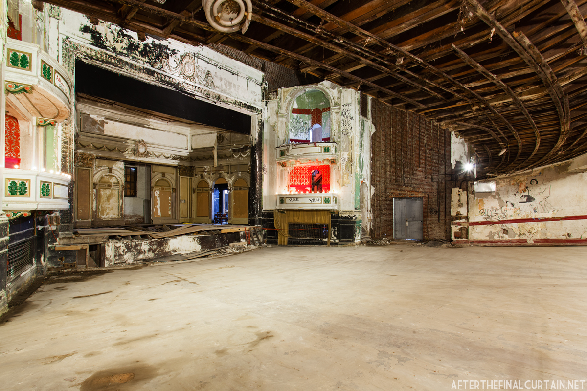 Showtime Restoration Volunteers cleaned up much of the interior of the theater by removing the old seats and the debris from the crumbling ceiling.