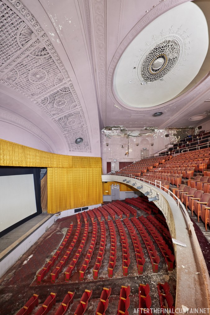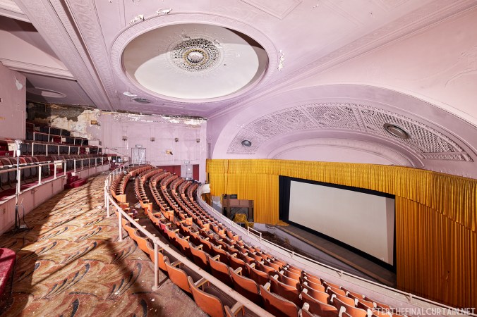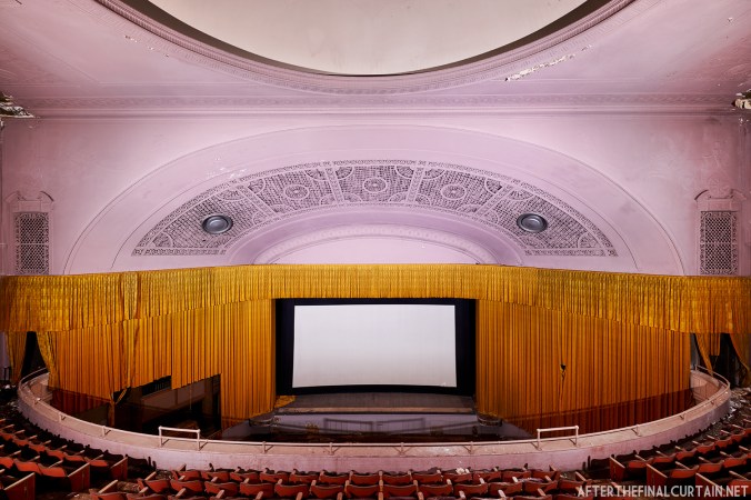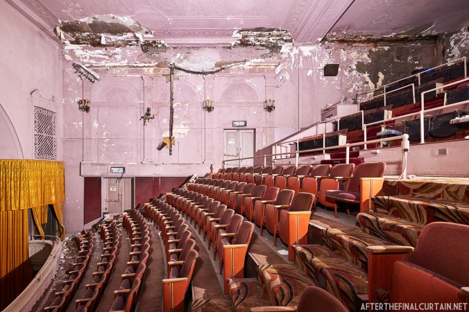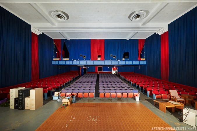 View of the auditorium from the stage.In September 2015, thieves broke into the theater, stole the sound amplifiers from the projectors and some lenses. The owner of the theater used the marquee to ask for its return. It read “Wanted: Stolen Projector Equipment Returned” for several months after the theft. The theater remains closed.