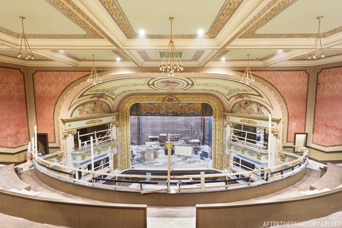 Work began in March 2016, when the partitions divided the auditorium into four screens were removed. Fortunately, those who did this work left much of the original plasterwork intact behind the new walls. Belknap EDC brought in Evergreene Architectural Arts to restore the plasterwork and recreate some of the details that had been destroyed or deteriorated over the years. For example, the original fire curtain remains intact but needs some work before it can be used.