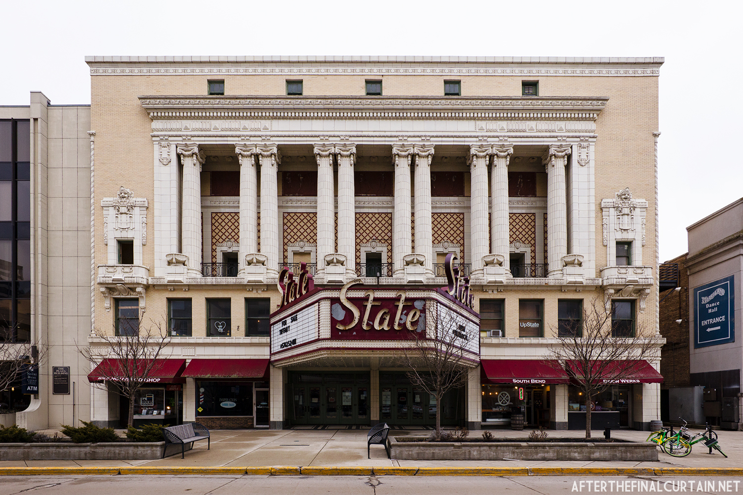 The building passed through a number of owners in the 1980s and 1990s before it was purchased for $20,000 by the Watseka Theatre Corp. Watseka made $500,000 in repairs to the building, and reopened it as a second run movie theater on March 25, 1993. However, it couldn’t compete with local multiplexes and in October 1996, it changed formats and became a live music venue and nightclub. It closed again in 2005. The State was purchased by Banko Capitol, a real estate investment firm, and reopened as a performing arts center and cultural center in the Spring of 2013. After operating infrequently it closed again in September 2016 after the theater was sold at a county auction due to unpaid taxes. A grassroots organization called “Save the State Theatre SB” was formed by an Indiana University South Bend student in early 2019 to try and raise the funds to purchase and reopen the theater.