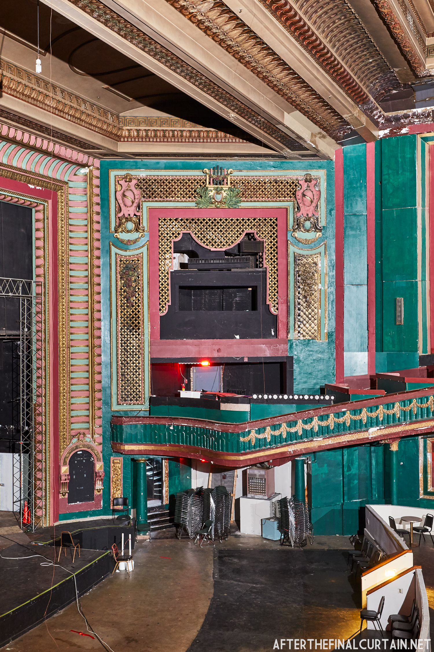 The organ chamber, which once held pipes for the theater’s Kimball organ, is now filled with a large speaker.
